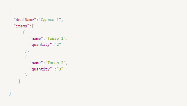 «Строки» — это неограниченный набор данных внутри какой-либо сущности. Например, у сделки в CRM-системе есть позиции товаров. Представьте, что в Albato приходит одна сделка, при этом у неё может быть неограниченное количество товаров. У каждой позиции свои одинаковые поля: название, количество и прочее. Все эти поля приходят одним массивом.