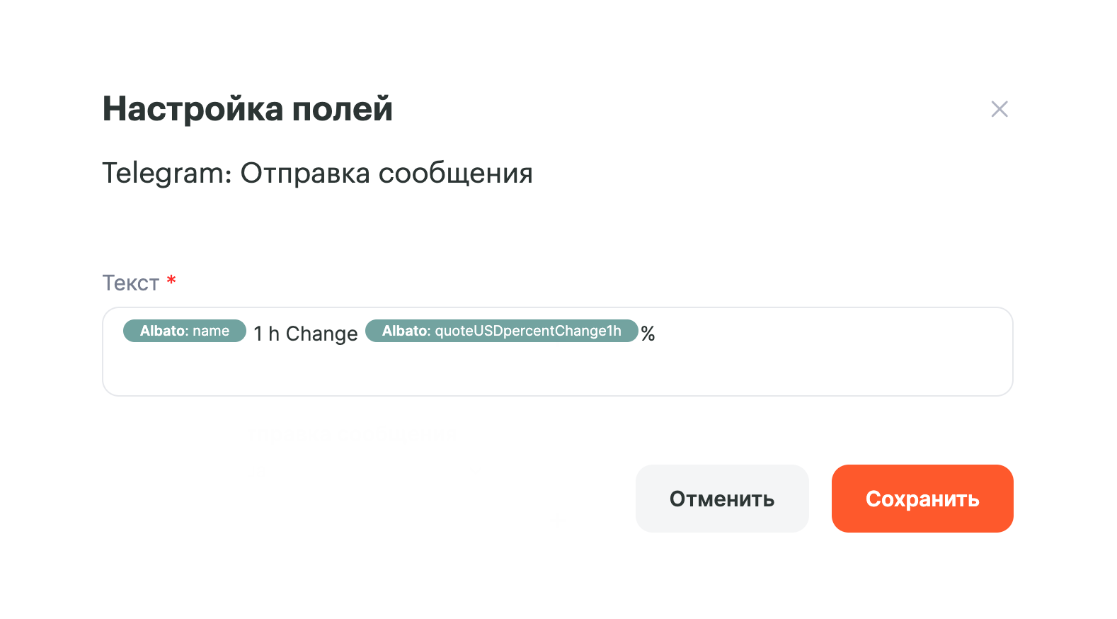 Разберем на примере передачи данных с сайта по отслеживанию цен на криптовалюты CoinMarketCup в Telegram. Наша задача: получать данные об изменении цены на выбранные криптовалюты в Telegram, и с помощью инструментов Albato задать фильтр, который будет передавать данные только если цена изменилась больше чем на 1%