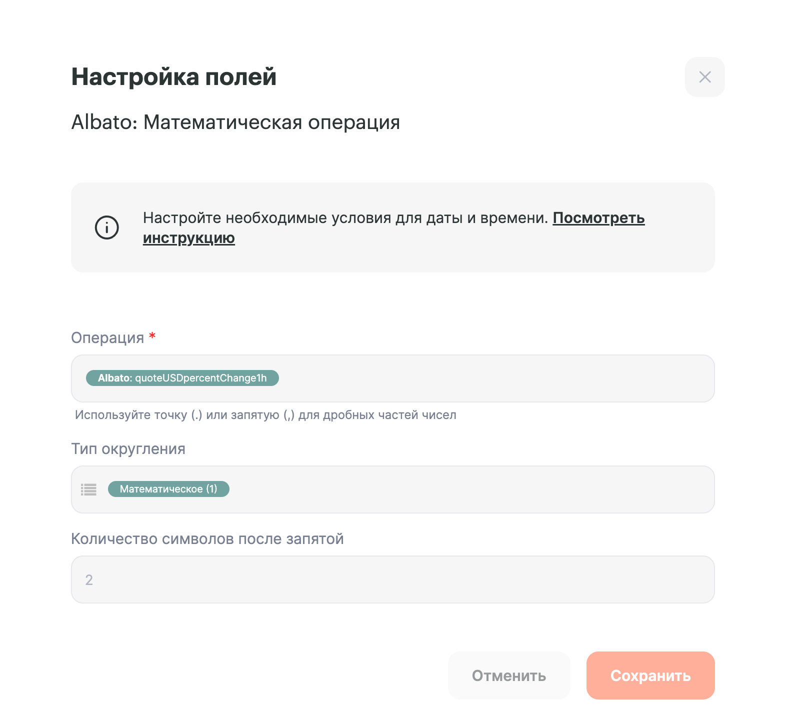 Здесь поможет инструмент Albato «Математическая операция». В его настройках укажем, где применить математическую операцию, «тип округления» и количество символов после запятой.