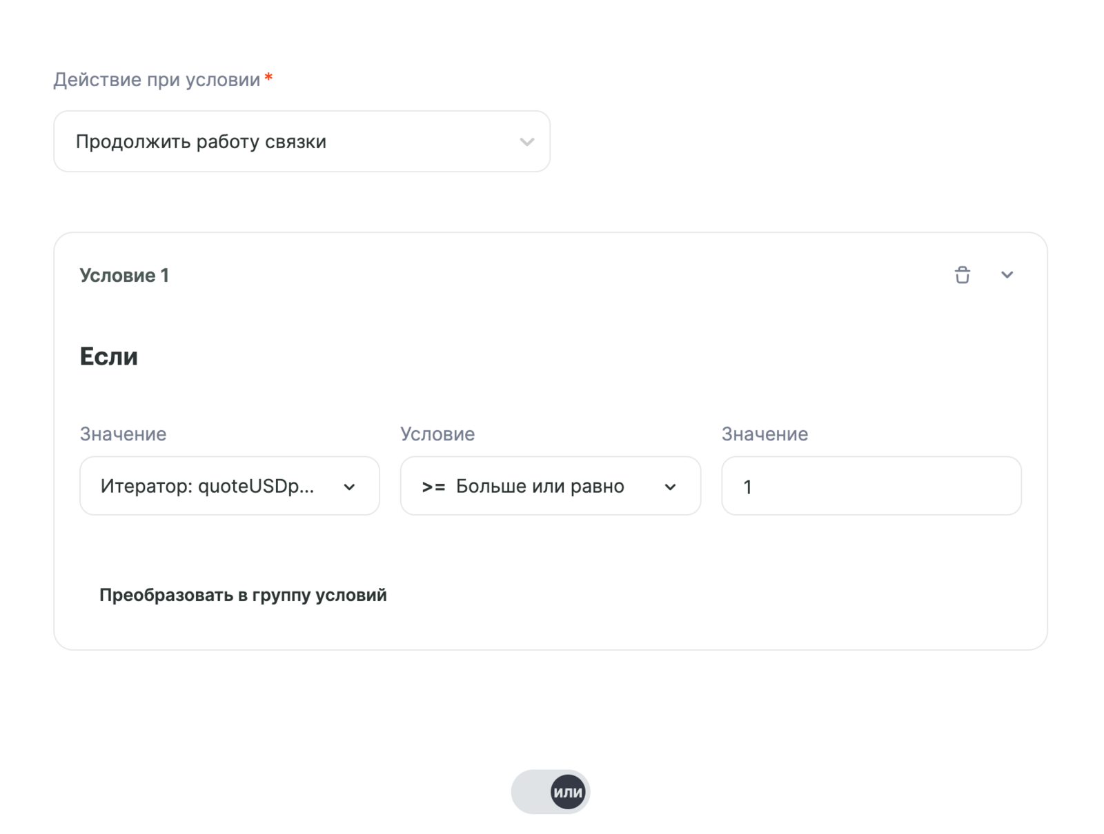 Осталось перед шагом «Математическая операция» добавить инструмент «Прервать связку при условии», чтобы передавать данные в Telegram только если изменения будут больше чем на 1%