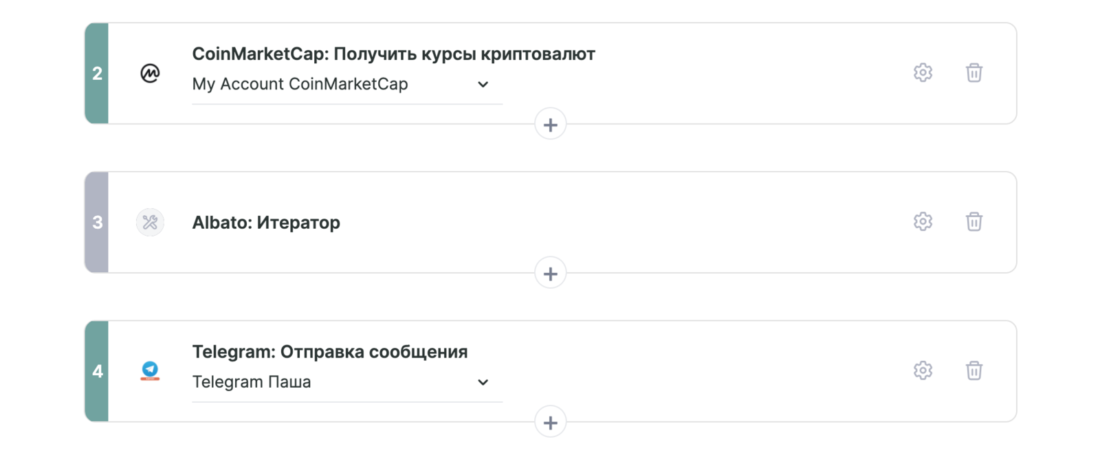 В связках «Итератор» будет обрабатывать отдельно каждый элемент массива. То есть шаги, которые есть в связке после «Итератора», запустятся столько раз, сколько вы получили элементов в массиве. Также к каждой сущности можно будет применять другие инструменты Albato.