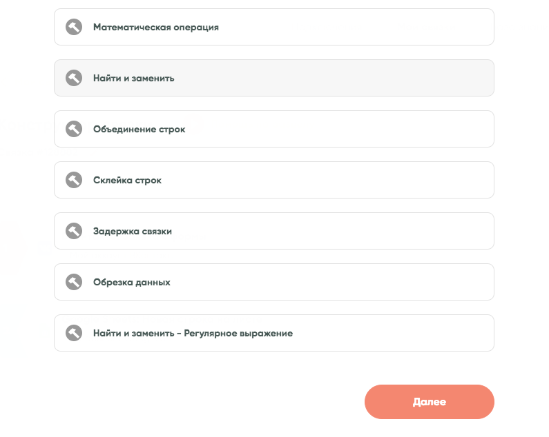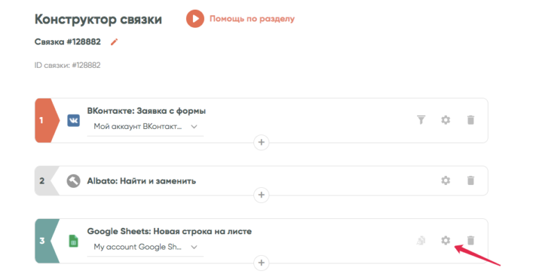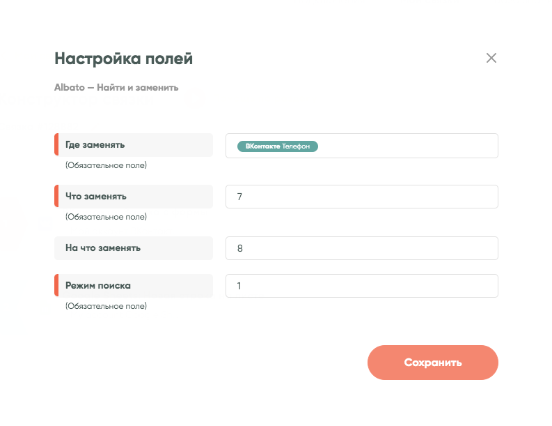 Теперь нужно, чтобы результат обработки записался в поле с телефонными номерами. Возвращаемся в конструктор связки и заходим в настройки следующего «действия»: