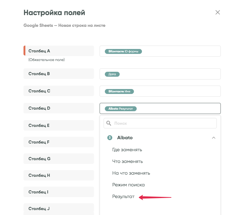 В открывшемся окне настроек указываем поле, куда подставлять получившийся результат. В нашем примере это телефонные номера — «Столбец D». Нажимаем на пустое поле и в выпадающем списке выбираем Albato и «Результат»: