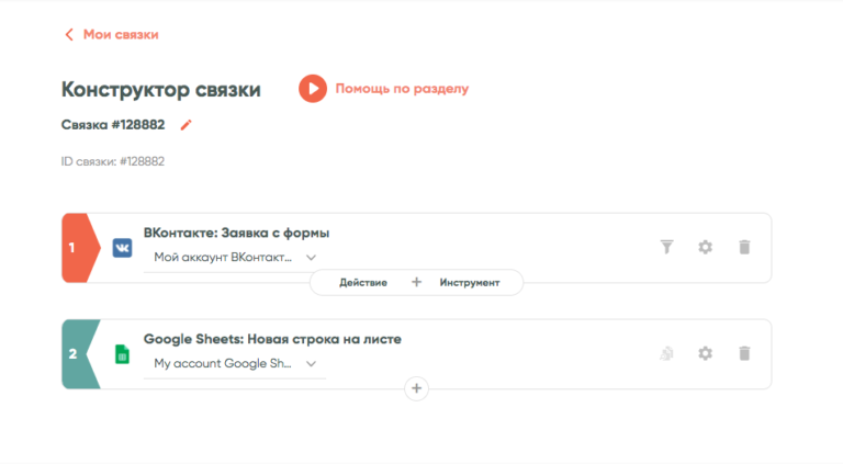 Переходим в конструктор связки — у нас это передача данных из лид-формы в VK. Выбираем событие, которое передает нужные нам данные и нажимаем на «+» (в нашем случае это «Вконтакте: Заявка с формы»). В появившемся окне выбираем «Инструмент»: