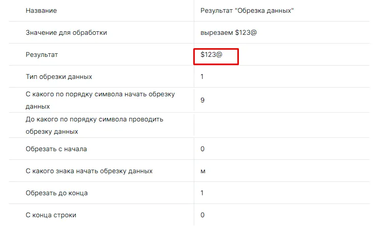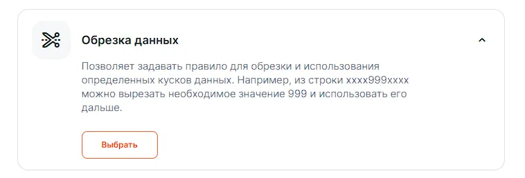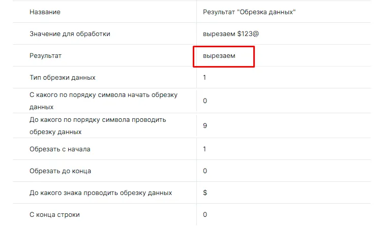 Инструмент позволяет обрабатывать данные, позволяя обрезать часть значения по заданному в настройке принципу. Работу этого инструмента можно сравнить с ножницами, что позволяют вырезать данные из любого набора значений. Инструмент может вырезать как половину строки (например, от начала до середины), так и произвольное значение в середине строки (например, с 3-ей по 5-ую букву).