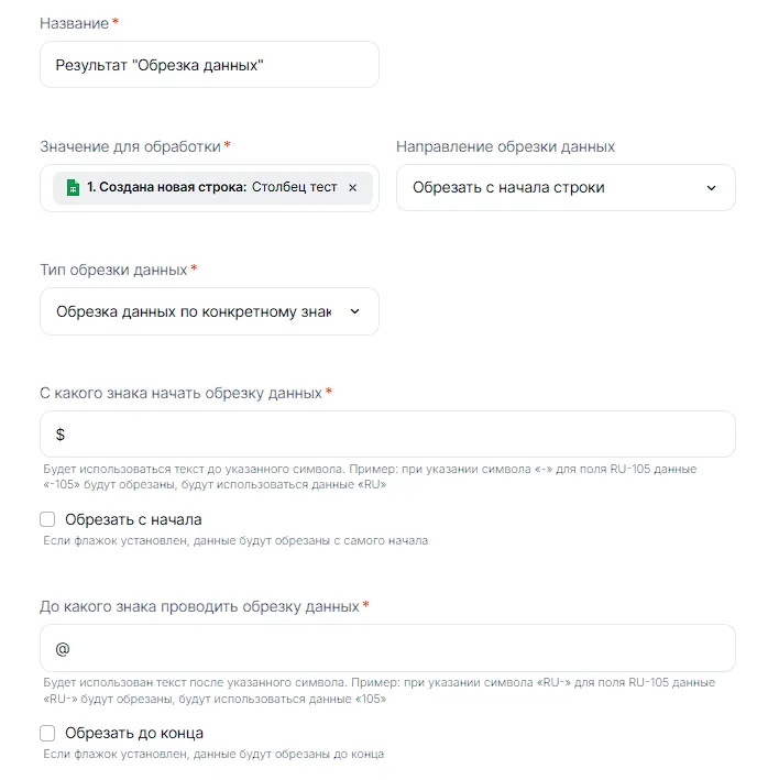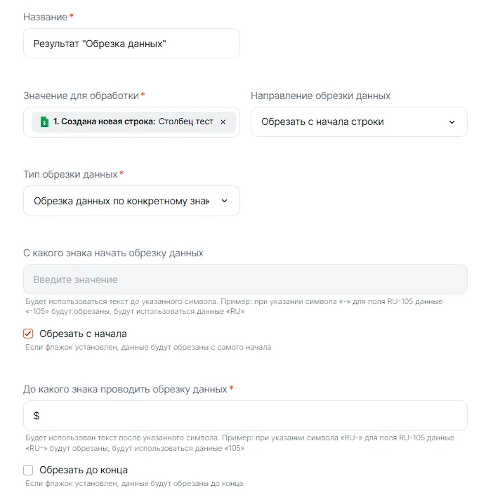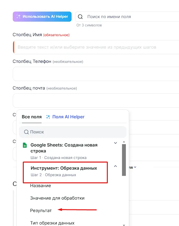 Для использования результата работы инструмента «Обрезка данных» вам необходимо будет перейти в настройки следующего шага и выбрать для поля значение «Результат» из настроенного ранее шага Albato.