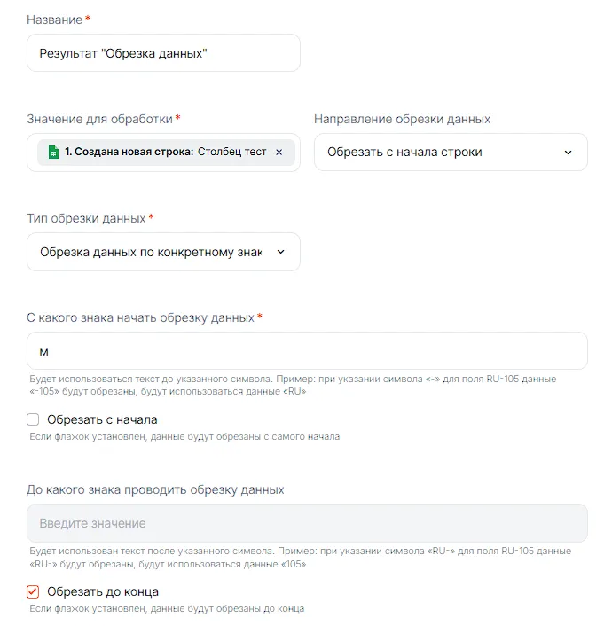 - В поле «До какого знака проводить обрезку данных» мы не вводим никакого значения, а проставляем под полем галочку «Обрезать до конца».