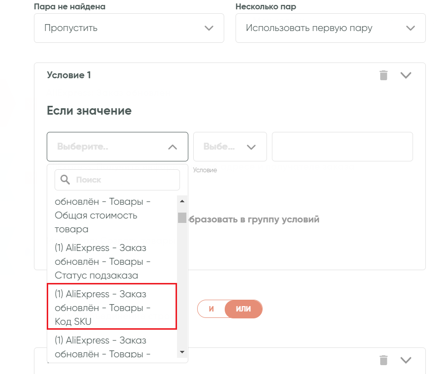 Также выберите сценарий, если удалось найти несколько пар объектов. Например, вы искали в «МойСклад» товары по названию и удалось найти два таких товара. Тут можно пропустить объект, использовать первый найденный, продублировать (если от AliExpress пришел один товар, а в «МойСклад» нашли два товара, инструмент отдаст две отдельные позиции товаров) или выкинуть ошибку: