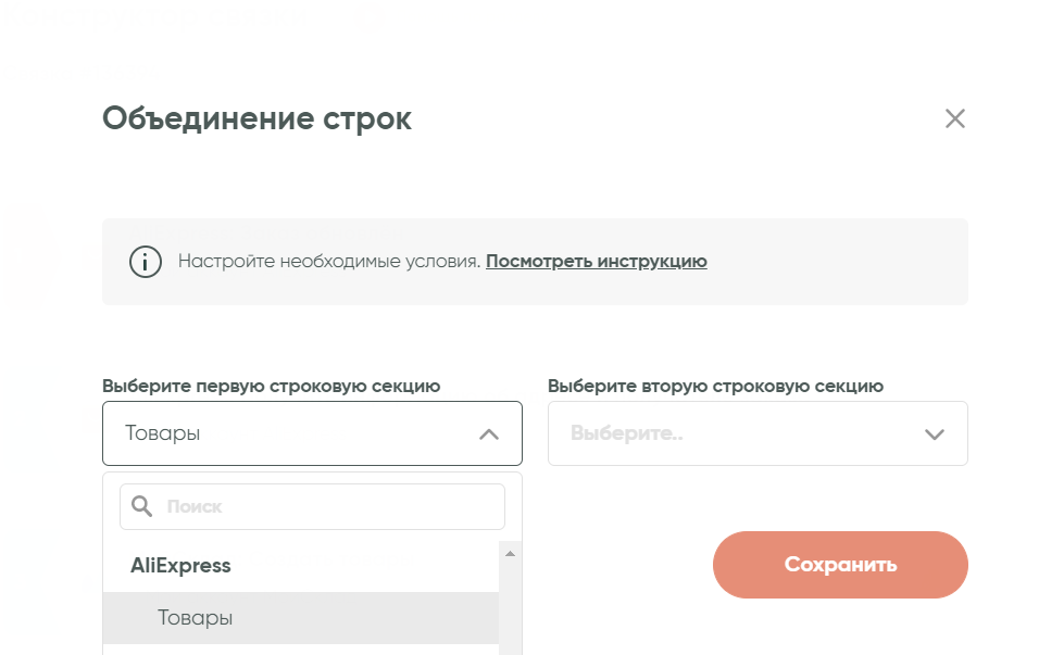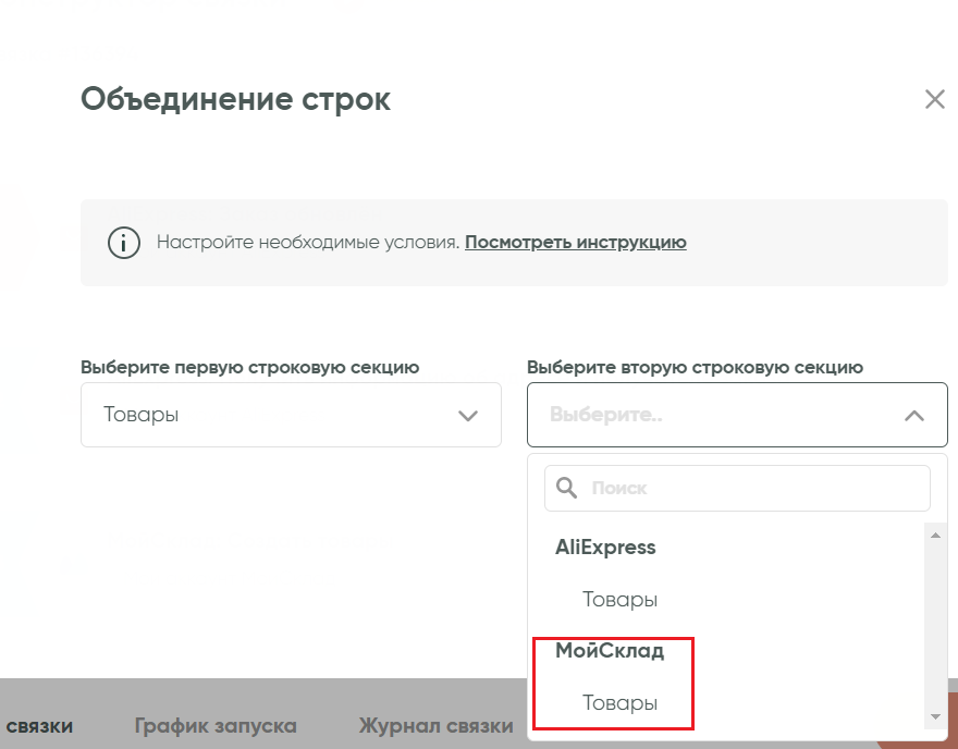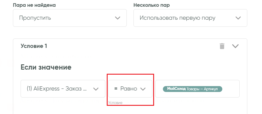 Допустим, вы хотите сопоставить товары от AliExpress с найденными товарами в «МойСклад» по SKU от AliExpress и по артикулу (так как ранее искали именно по ним). Для этого настройте инструмент следующим образом: