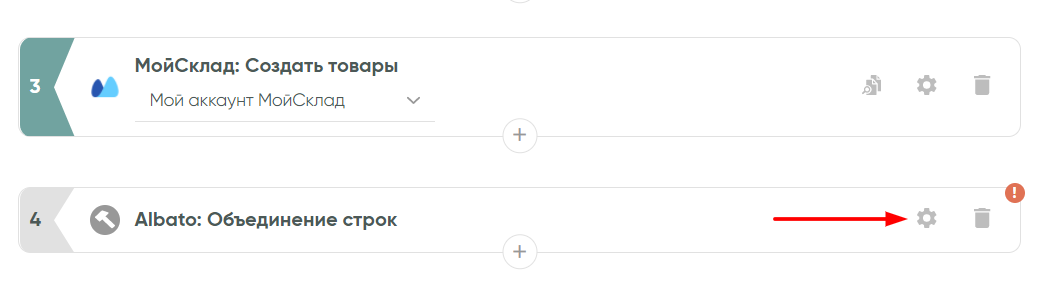 Тут есть проблема: у нас есть «строки» нашего триггера от AliExpress и «строки» нашего действия, которое нашло в «МойСклад» нужные нам товары. Теперь надо как-то объединить между собой два этих массива данных перед созданием заказа, так как мы хотим количество товара передать от AliExpress, а ID товара прислать тот, что нам отдал в ответ «МойСклад».