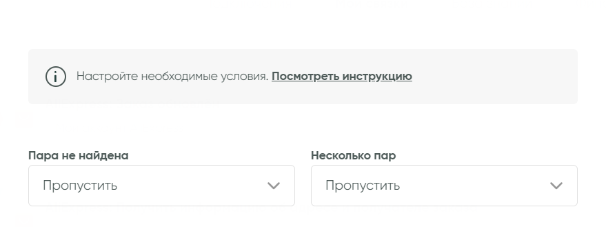 Выберите, что нужно делать инструменту при отсутствии пары, то есть в случае, когда вы не смогли сопоставить две «строки» от двух шагов. Например, если «Шаг 2» не нашел нужный товар, можно пропустить данный объект, заполнить его пустоты или выкинуть ошибку (в данном случае, связка останавливается).