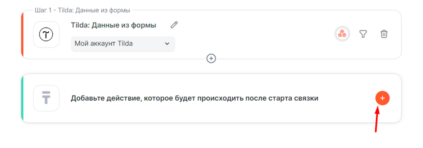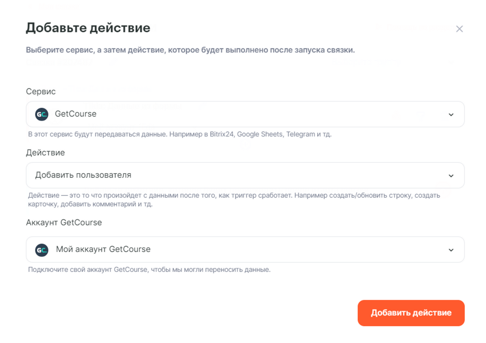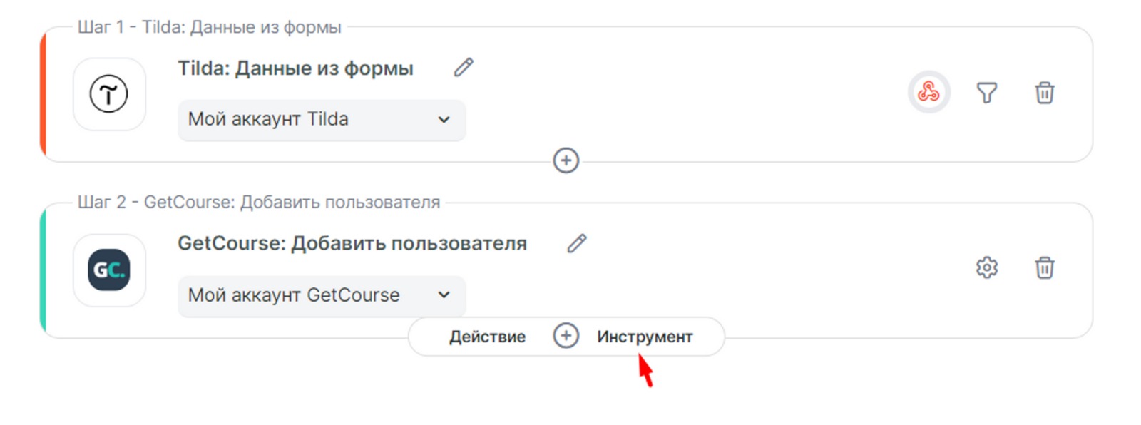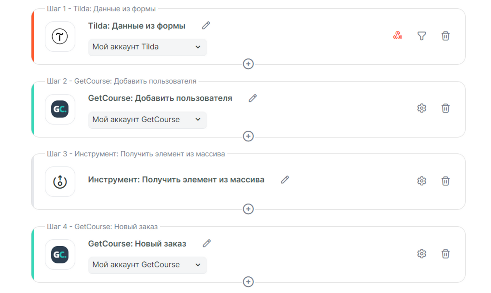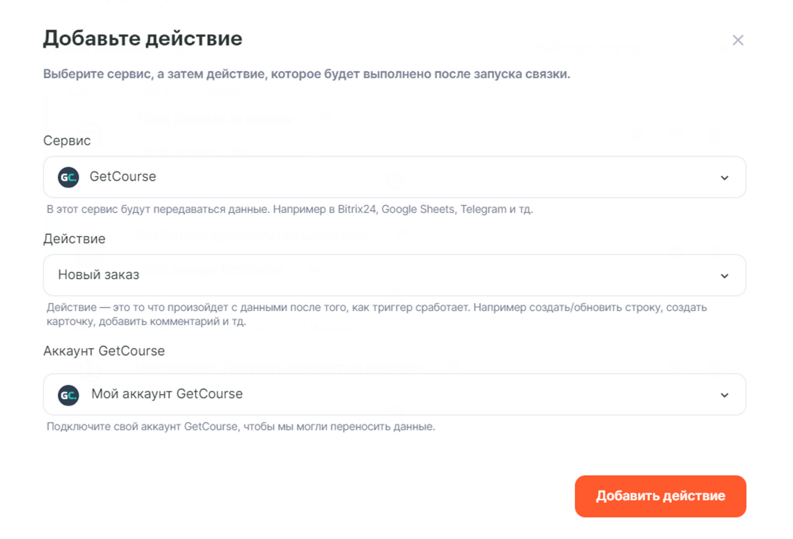 Теперь можно добавить действие Новый заказ GetCourse в связку
