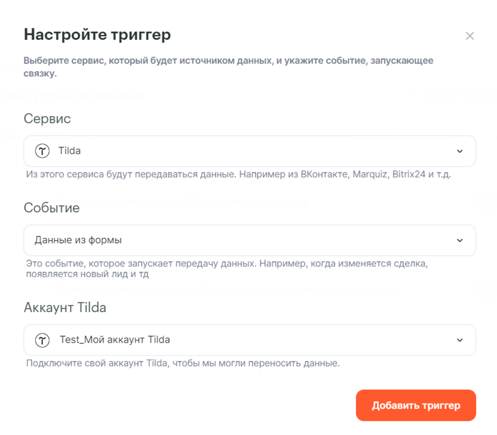 Добавим триггер (первый шаг/источник данных) в связку. Заполним поля следующим образом: