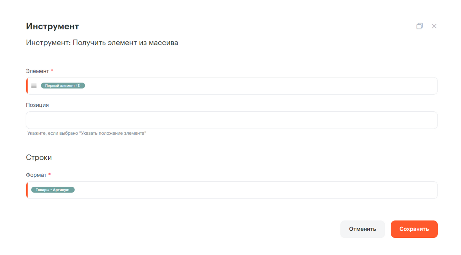 Инструмент позволит получить нужный элемент по его номеру в списке из строковой секции. Можно выбрать, какой элемент получать, указав номер позиции. Нумерация элементов начинается с 1.