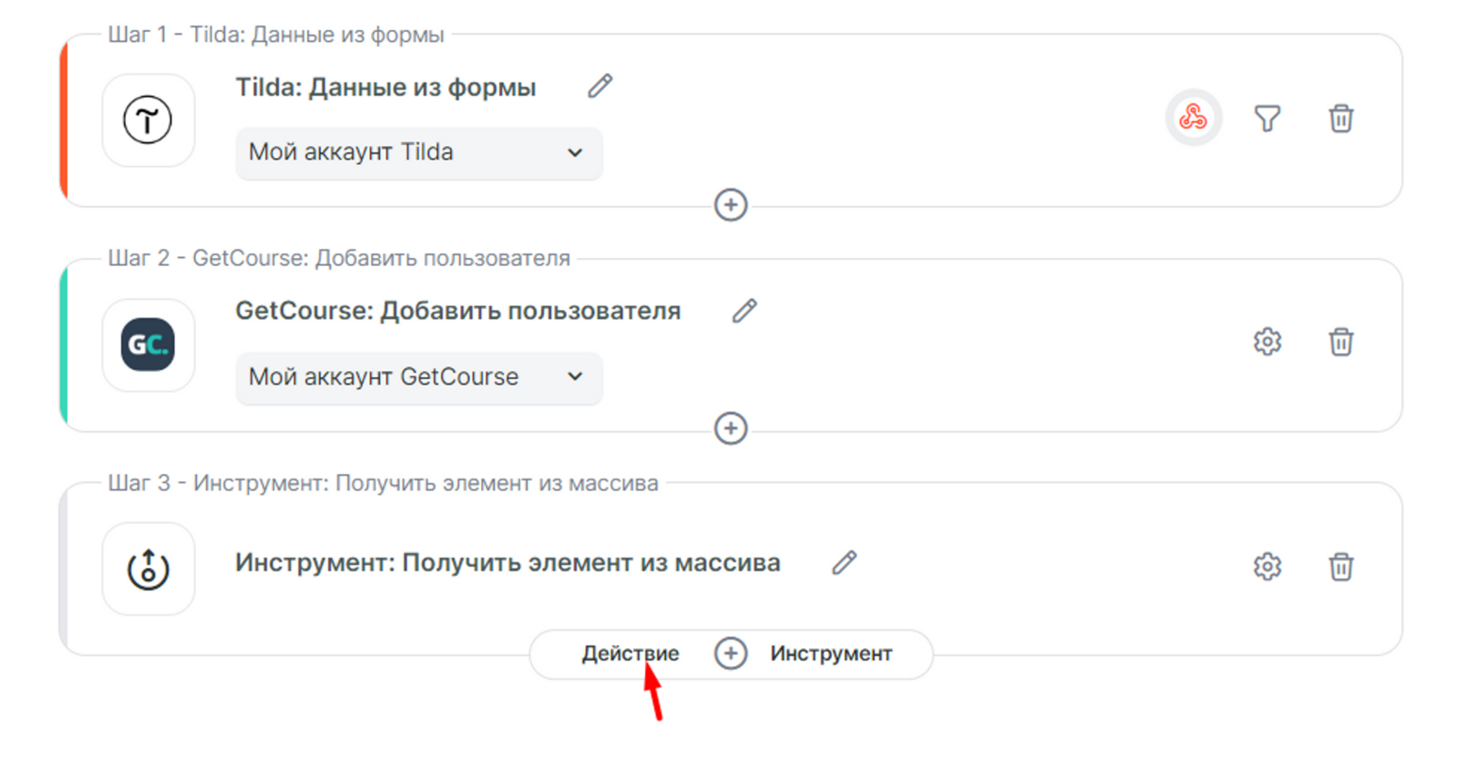 Перед тем, как добавить шаг GetCourse — Новый заказ к пользователю, настроим получение первого товара из корзины с помощью инструмента «Получить элемент из массива». Для этого нажмите на «+» и выберите из списка инструментов необходимый.