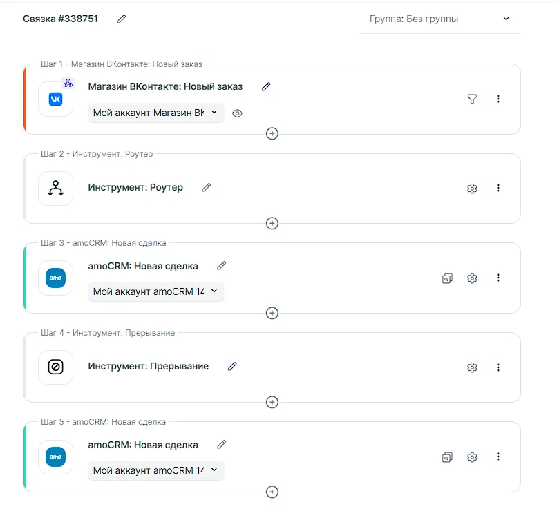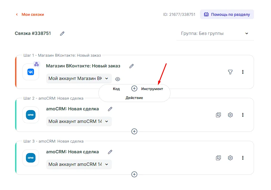 ВАЖНО: в инструменте нужно указать шаги, с которых связка продолжит работу после инструмента, поэтому эти шаги должны присутствовать в связке. Мы рекомендуем сначала настроить нужные шаги/сценарии, а потом добавлять инструмент.