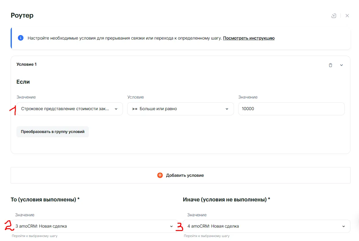 Инструмент «Роутер» позволит выстроить сценарий, в котором мы, в зависимости от суммы заказа, назначаем разных менеджеров.