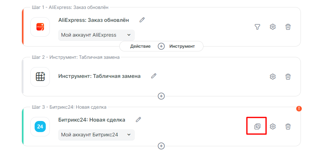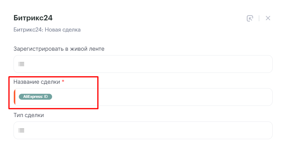 Воспользуемся функцией обработки дублей при создании новой сделки, чтобы найти уже имеющуюся. Данный пример подразумевает, что при первоначальном создании сделок в «Название» создаваемой сделки передавался ID заказа из AliExpress. Для работы шага «Битрикс24: Новая сделка», который в действительности обновляет статус существующей сделки, так же необходимо передавать в поле «Название» ID заказа из AliExpress.