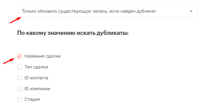 Правило обработки указываем «Только обновить существующую запись, если найден  дубликат» а в качестве поля по которому будет происходить проверка на соответствие выбираем «Название сделки»: