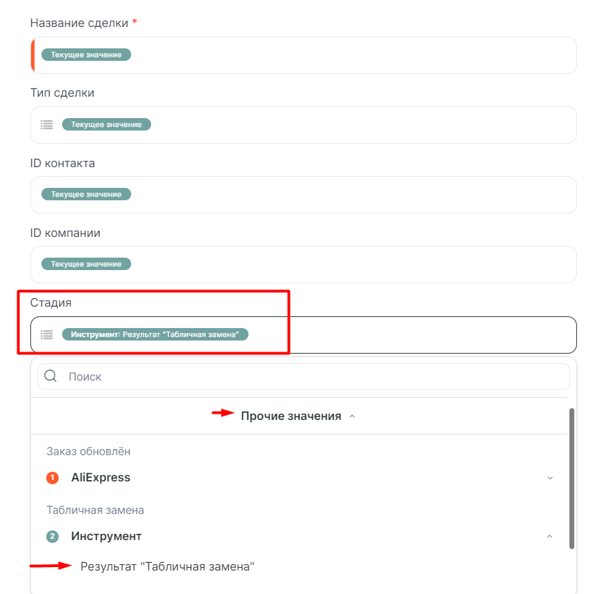 Во всех полях будет расположено «Текущее значение» что означает — поле сохранит уже имеющиеся данные. Для обновления данных потребуется указать новое значение. Поставьте курсор в поле «Стадия», удалите «Текущее значение» как обычный текст и положите переменную из инструмента «Табличная замена — Аlbato». Для этого, в появившемся списке найдите раздел «Прочие значения», а в нем — шаг «Табличная замена — Аlbato». Выбираем из него переменную с созданным ранее названием, в нашем случае это «Инструмент: Результат Табличная замена»: