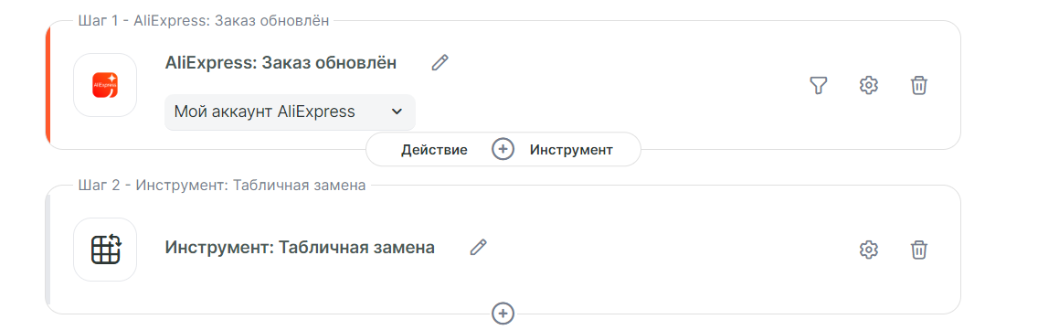 Откройте раздел «Конструктор связки» и добавьте инструмент между двумя шагами. Нажмите «+» , выберите «Инструменты», в открывшемся окне найдите пункт «Табличная замена»: