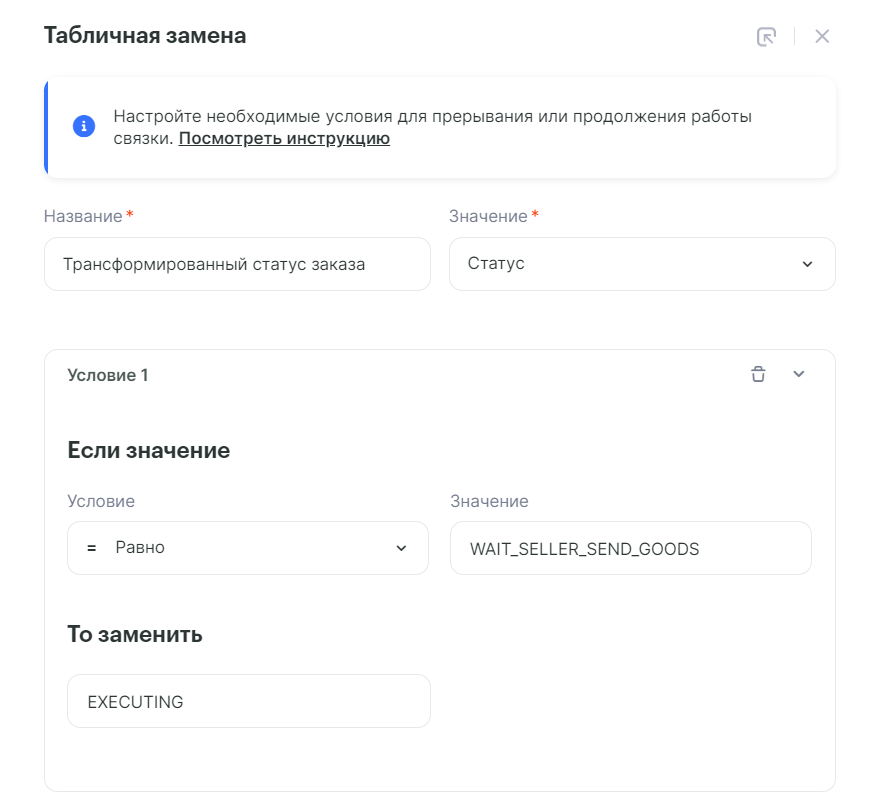Условие. Указать исходное значение статуса и конечное. Чтобы лучше понять механику табличной замены, достаточно переформулировать конструкцию и привести к следующему виду: «Если значение в поле Х равно значению Y, то дальше по связке передать значение Z».