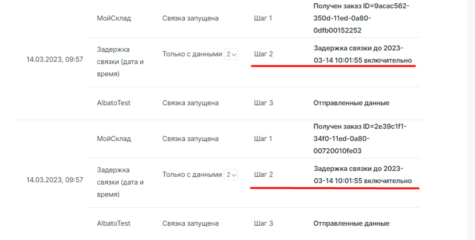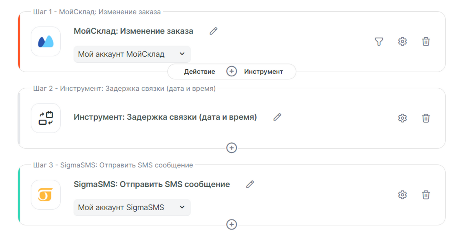 Заказы от Моего склада поступили в 09:57 и ранее, а шаг с отправкой смс сработал только после отработанного шага с инструментом.