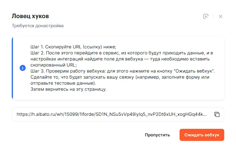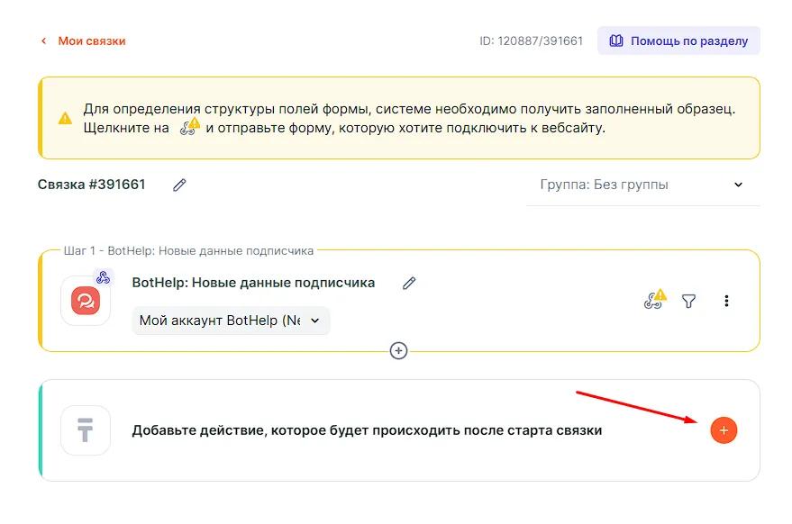 Если вы планируете работать с дополнительными полями, нажмите на кнопку «Ожидать веб-хук». Затем инициируйте в BotHelp диалог с ботом, чтобы ваши данные, как нового подписчика, были переданы по связке. После этого дополнительные поля станут доступны.