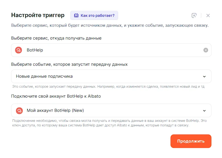 Вы можете создать связку с любым другим событием из BotHelp. Выполняйте настройку точно так же, за исключением выбора события на втором шаге создания связки.