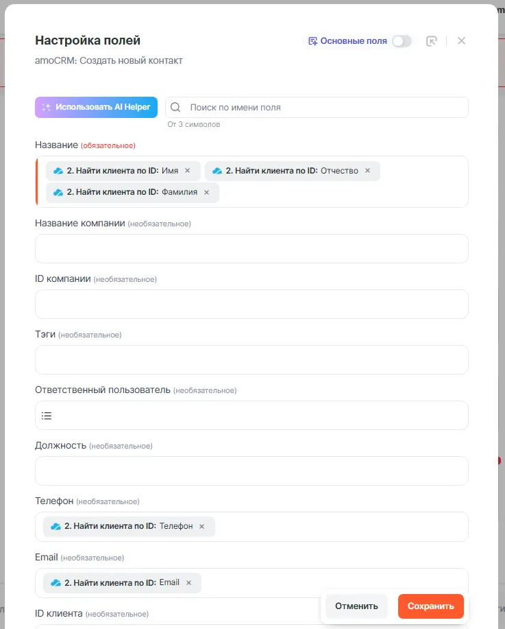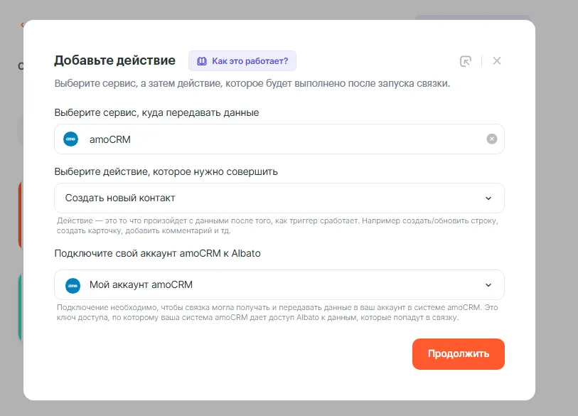 - Какое действие выполнить, когда запустится связка — Создать новый контакт.