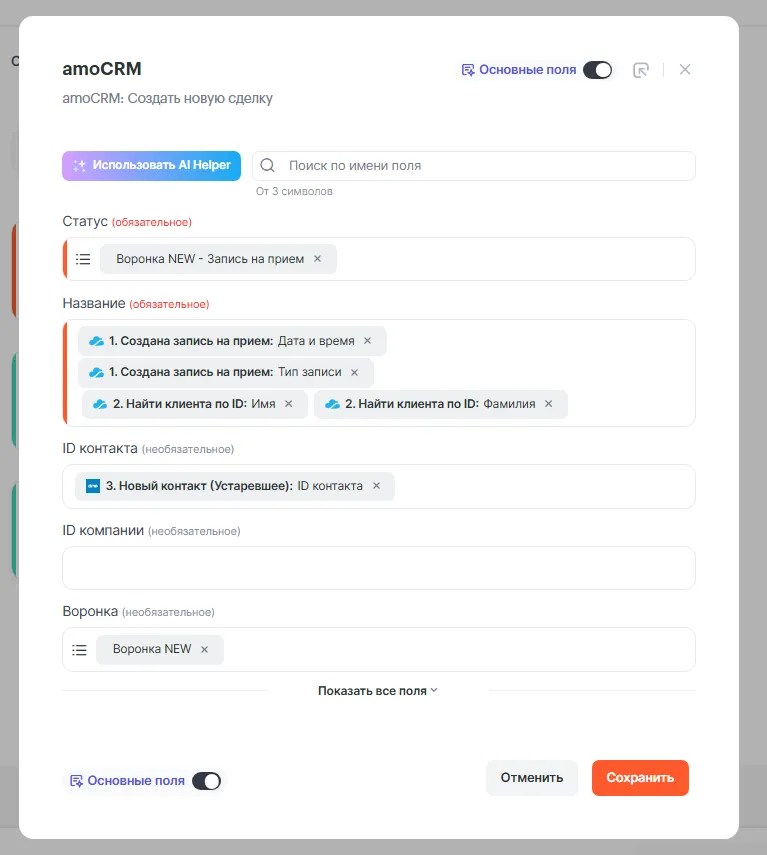 Заполняем поля данными, которые должны отображаться в сделке. Пример заполнения на скриншоте: