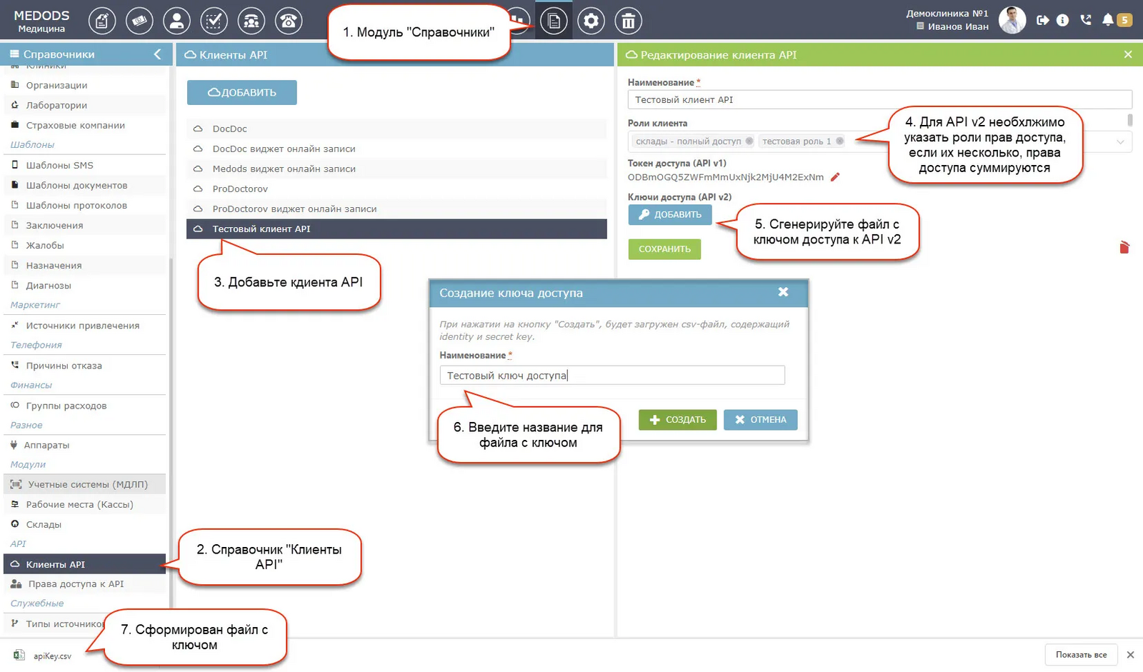Для подключения Medods перейдите в раздел Подключения, нажмите Добавить подключение, выберите Medods, затем введите требуемые параметры, а именно Домен вашего аккаунта Medods, identity и secretKey. Как их получить описано на скриншоте ниже.