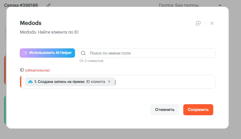 - Какое действие выполнить, когда запустится связка — Найти клиента по ID.