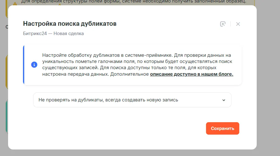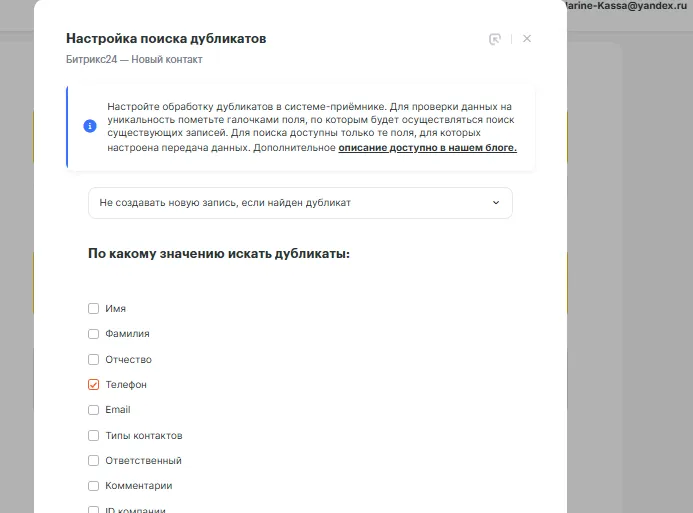 Выберите из выпадающего списка: Не создавать новую запись, если найден дубликат