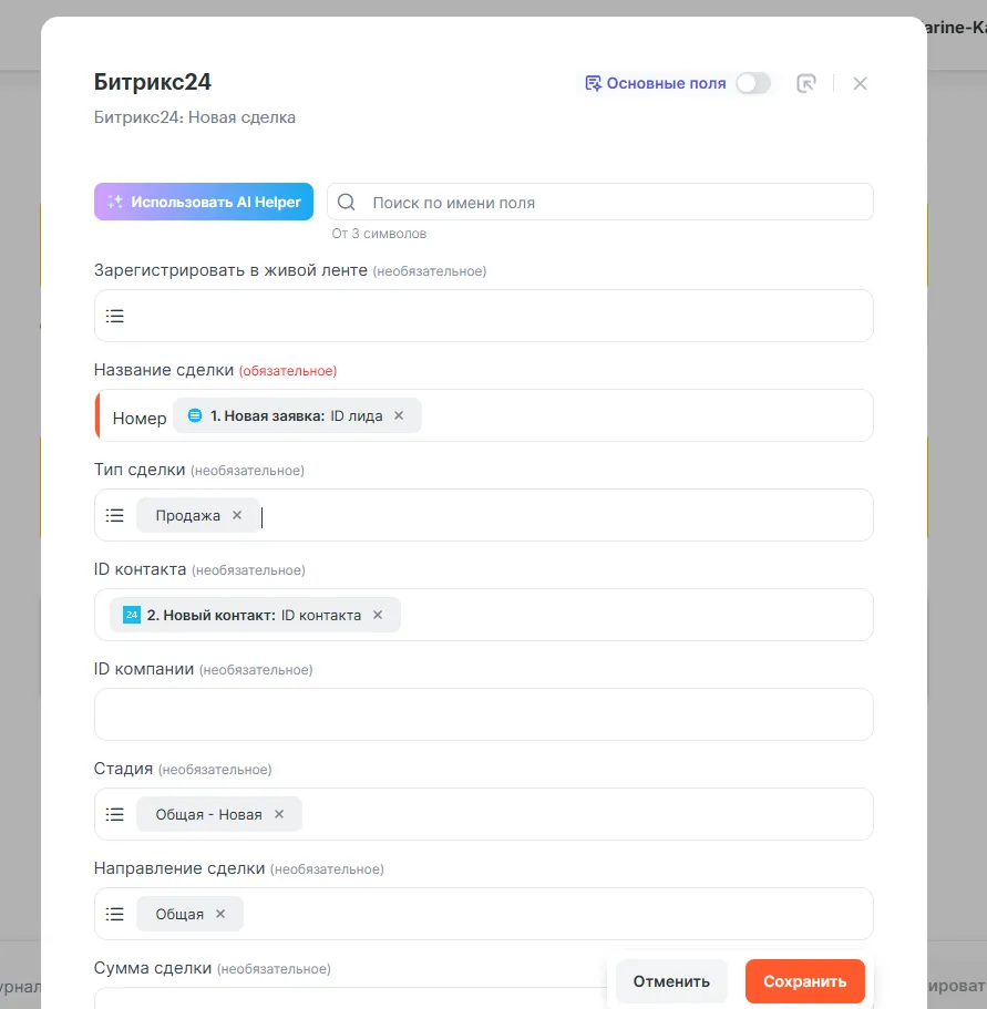 - Название сделки — можно указать, например: Сделка №{{номер лида}}