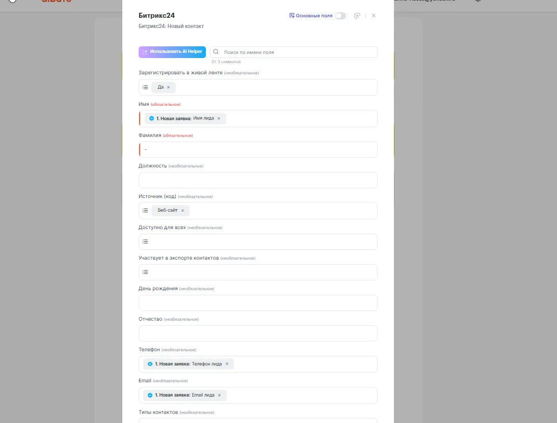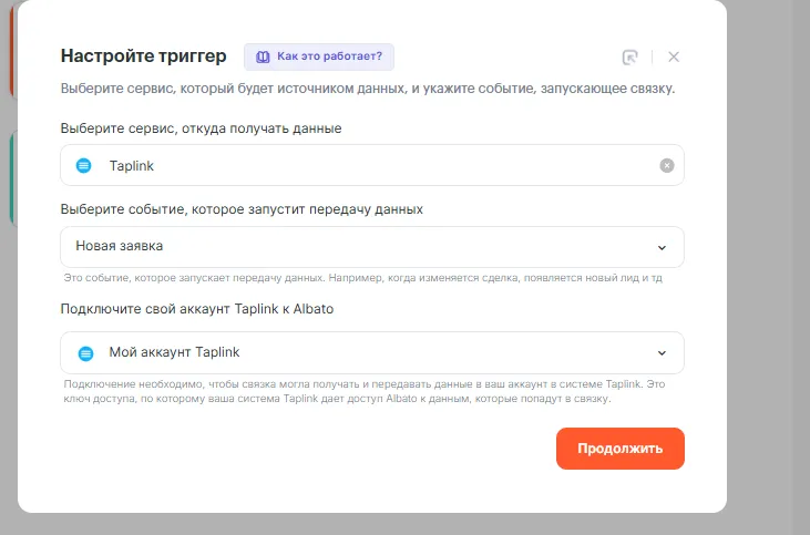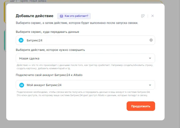 Теперь при каждой новой заявке в Taplink Albato автоматически создаст контакт и привязанную к нему сделку в Битрикс24.