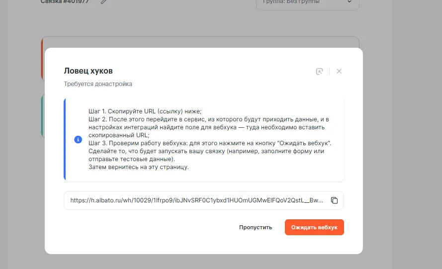 Убедитесь, что вебхук активен на странице, с которой планируется передача данных.Если не все поля отобразились — нажмите Ожидать веб-хук снова и повторите отправку формы.