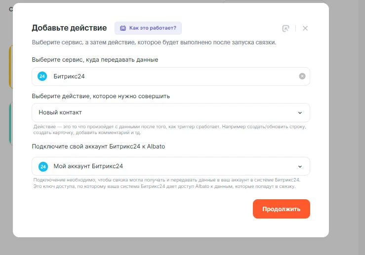 Шаг 3. Настройка действия — Новый контакт в Битрикс24