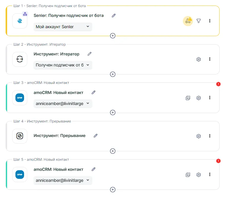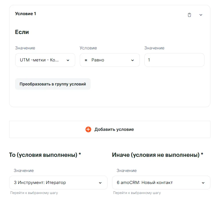 После шага 1 добавляем инструмент роутер и настраиваем его: если метки есть, их количество равно 1, то будем переходить к итератору, иначе сразу создавать контакт