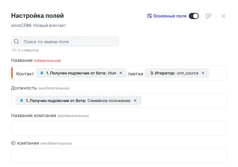 - Действие — amoCrm новый контакт