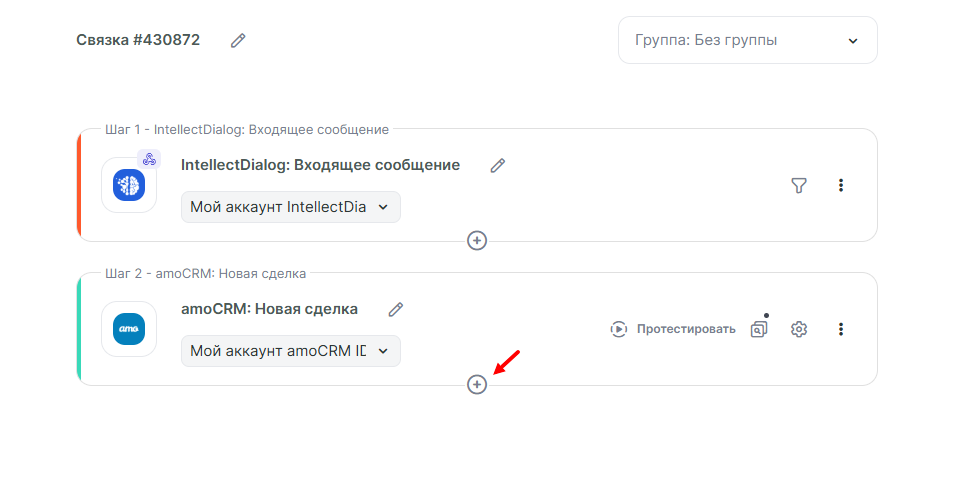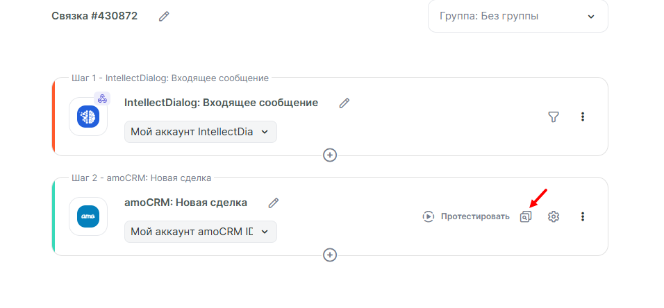 Рассмотрим, как автоматизировать работу с IntellectDialog на примере: нам нужно передавать входящие сообщения из группы ВКонтакте в amoCRM. А потом передавать сообщения клиенту в ВКонтакте, когда в CRM обновится статус сделки. Чтобы настроить такой сценарий, понадобится две связки.