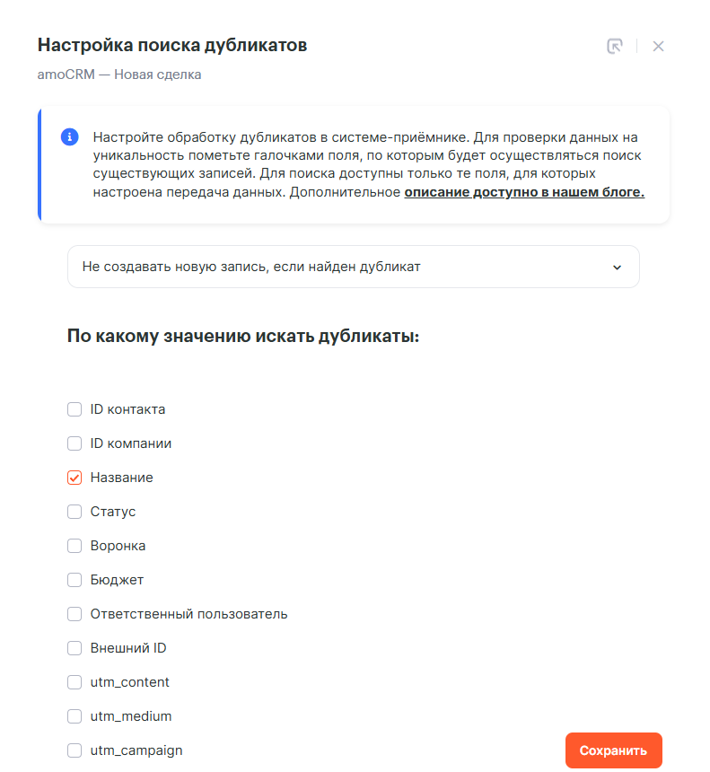Выбери «Не создавать новую запись, если найден дубликат», а для проверки возьми «Название», потому что в это поле подтягивается телефон персоны из IntellectDialog.