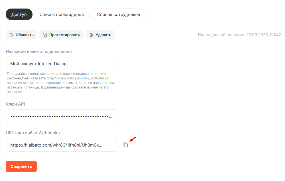 После этого, скопируй вебхук из подключения Albato: