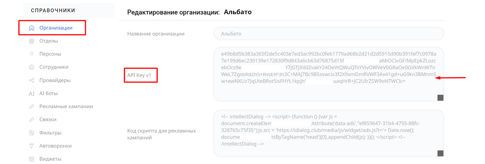 В новом окне укажи название подключения и API-ключ. Чтобы его найти, зайди в раздел «Организации» в личном кабинете IntellectDialog.