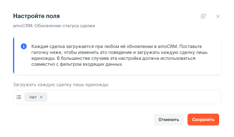 В следующем окне выбери, пропускать каждую сделку по связке при обновлении её статуса или загружать только один раз.