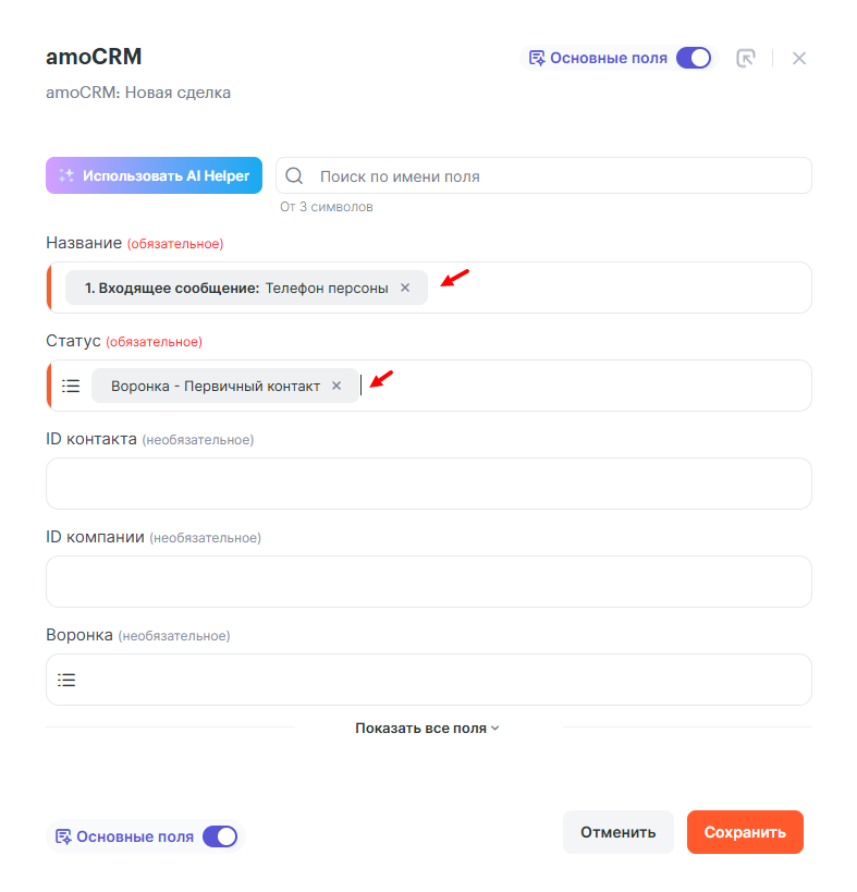 • ID контакта/сделки — параметр ID сделки из второго шага связки.