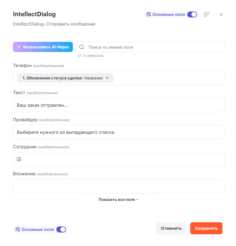 В открывшемся окне настроек сопоставь поля amoCRM и IntellectDialog. Поля, отмеченные красным — обязательные.
