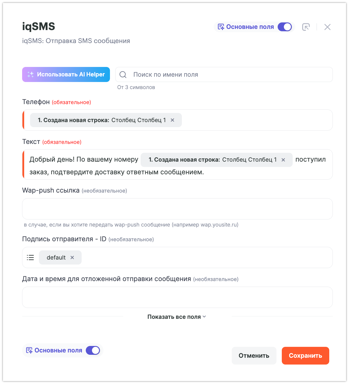 В открывшемся окне настроек сопоставьте поля Google Sheets и IqSMS. Пример заполнения шага: