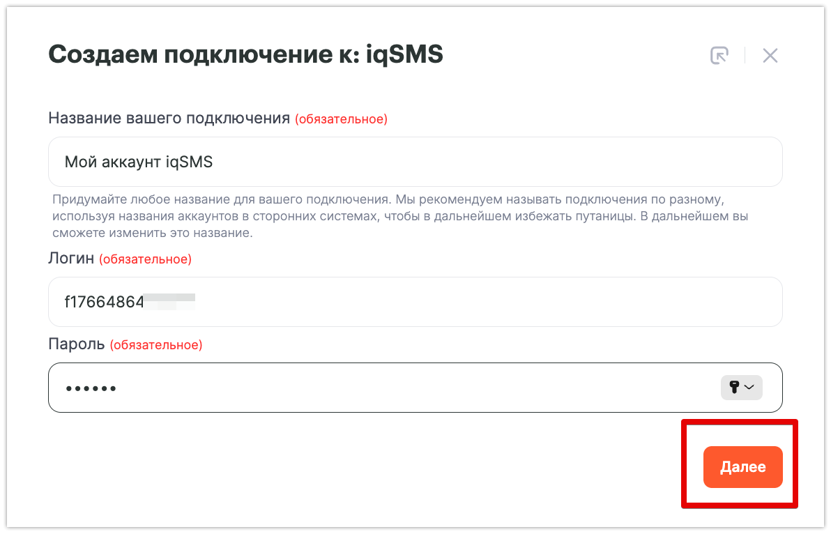 Нажмите «Добавить подключение», задайте ему название и введите данные для входа в IqSMS — логин и пароль.