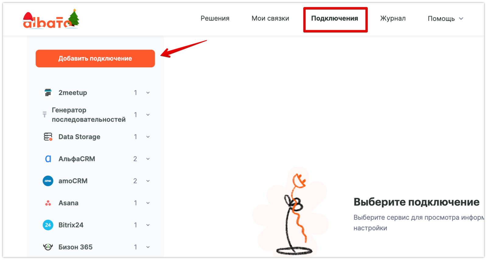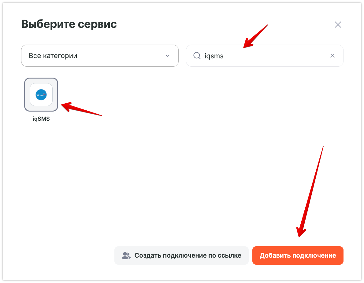Зайди в раздел «Подключения», нажми на кнопку «Добавить подключение» и выбери из списка «IqSMS».